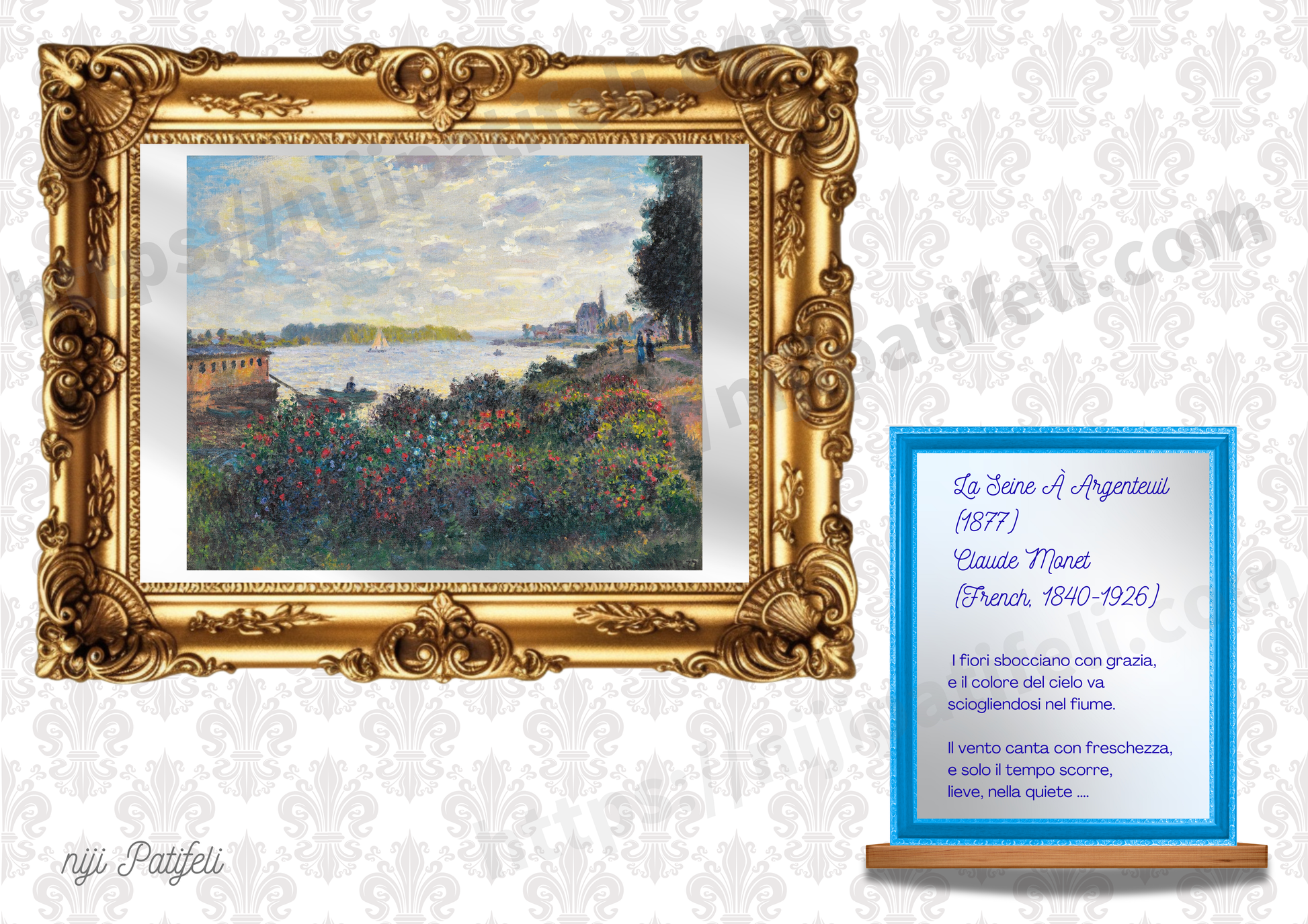 【A】デジタルアート A3【🌈南欧パティオ空間】名画シリーズ「花あふれる静寂のセーヌ川、モネ名画風・詩が寄り添う額縁アート」