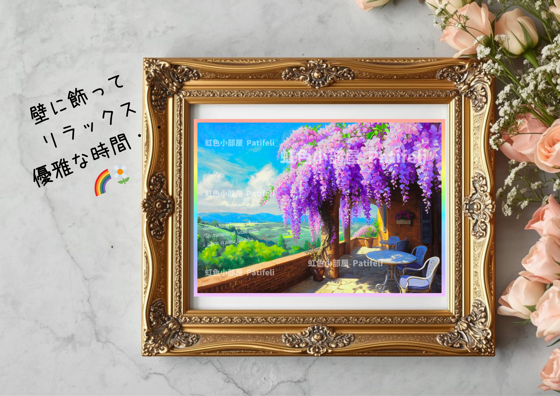 🌟この商品をお部屋に飾ってリラックスしたり、懐かしさを感じている人をイメージして、イタリア国旗カラーのハート型デザインとともにオリジナル文章を組み合わせています。全体的に華やかな藤花の印象と、奥行きのある空と緑の落ち着いた風景の印象が、絶妙にマッチした油絵風デザインに仕上げています。
